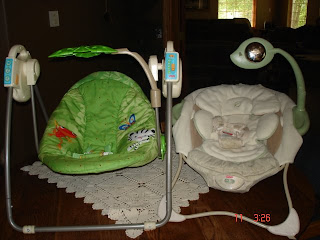I been shoping and I think i got a pretty good deal hear the green one is a swing with music i got it at a garage sale for Ten dollars Like New...